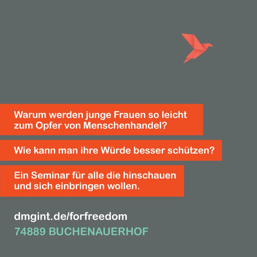 06.-07. November, Freitag 18:00 bis 21:15 und Samstag 08:00 bis 16:00 in Sinsheim. Es gibt die Möglichkeit als Tagesgast zu kommen oder auf dem Buchenauerhof zu übernachten – die Preise variieren dementsprechend. Für Verpflegung ist gesorgt. Sich anmelden und ein Zimmer buchen können Sie noch bis zum 18. Oktober auf: www.dmgint.de/forfreedom