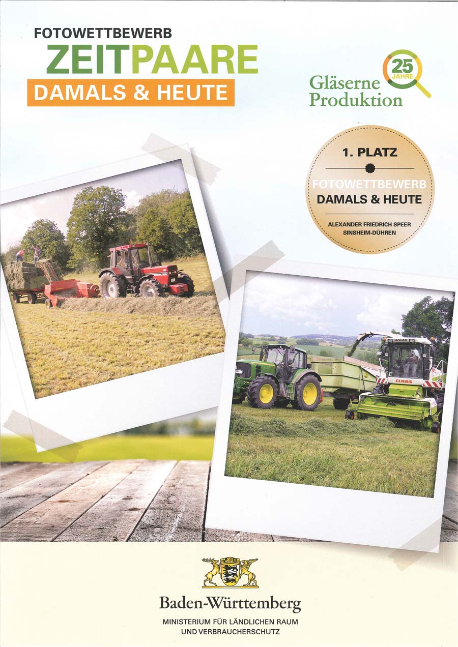 Eine Fachjury bestehend aus Expertinnen und Experten aus der Verwaltung unter Vorsitz von Ministerialdirektor Wolfgang Reimer hat die eingegangenen Bildpaare bewertet und die Gewinnerinnen und Gewinner ausgewählt. Der 1. Platz ging an Alexander Speer aus Sinsheim-Dühren (Rhein-Neckar-Kreis). Mit seinen Bildern zur Grasernte verdeutlicht er die Entwicklung der vergangenen Jahre. Als Hauptpreis konnte er – ganz im Sinne des Wettbewerbs – ein besonderes ZeitPaar mitnehmen: eine moderne Digitalkamera und eine Sofortbildkamera nach altem Vorbild.