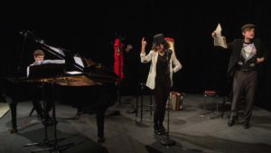 Die drei Kanditen: Paul Hofmann-Wellenhof (Schauspieler), Klara Finck (Schauspielerin und Sängerin) und Nikola Dragosavac (Pianist) sind Musikkabarett.