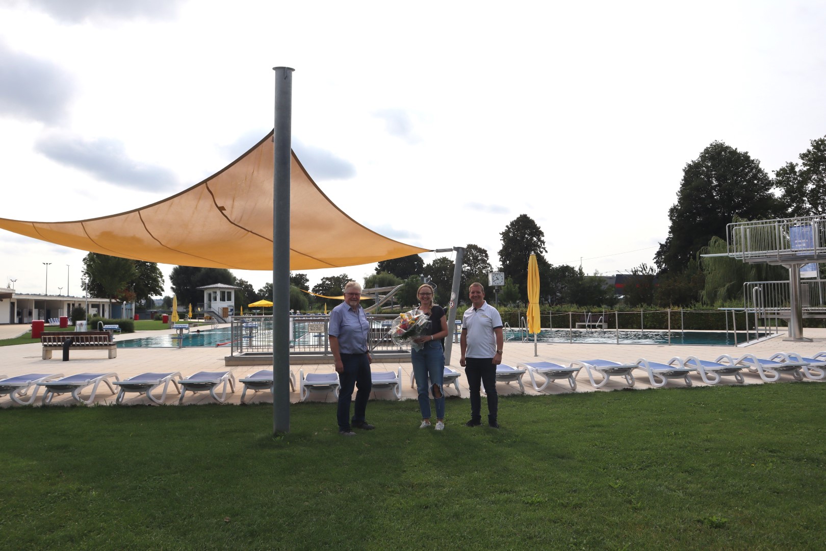 Bei knapp unter 20 Grad und bewölktem Himmel kamen am Vormittag dennoch einige unerschrockene Besucher ins Freibad Sinsheim. Unter ihnen auch Franziska Berthold aus Bad Schönborn. Sie staunte nicht schlecht, als sie an der Kasse vom ersten Stellvertreter des Oberbürgermeisters Peter Hesch und Freibadleiter Fabian Zimmer empfangen wurde; Berthold ist die hunderttausendste Besucherin dieser Saison. Sie durfte sich über einen liebevoll gestalteten Blumenstrauß und eine Dauerkarte für die kommende Saison freuen.