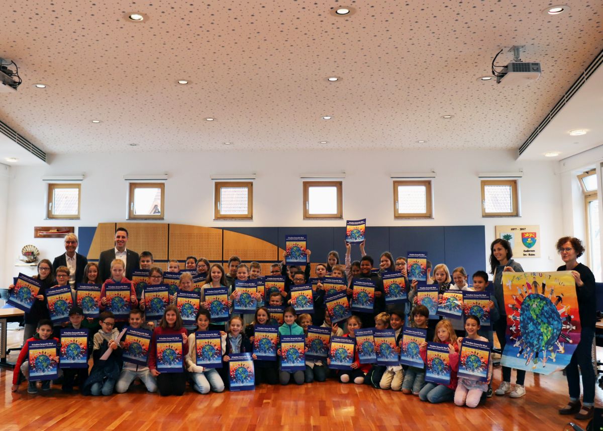 (zg) „Frieden braucht Mut“: Schülerinnen und Schüler der Klassen 4a und 4b der Schillerschule in Nußloch gewinnen den Plakatwettbewerb Volkstrauertag 2019. „Herzlichen Glückwunsch zu diesem tollen Plakat“, begrüßte der Bürgermeister der Gemeinde Nußloch, Joachim Förster, bei einem kleinen Empfang im Ratssaal der Gemeinde Nußloch am 7. November 2019 49 Schülerinnen und Schüler der beiden vierten Klassen der Schillerschule mit ihren Lehrerinnen. Er dankte allen für diese kreative Idee. Ganz besonders freue ich mich darüber, dass dieses aussagekräftige Plakat nun in allen 54 Kommunen des Rhein-Neckar-Kreises für den Volkstrauertag 2019 wirbt“, so der Bürgermeister und sagte weiter: „Ich bin sehr stolz auf Euch und freue mich über Euren Sieg!“.