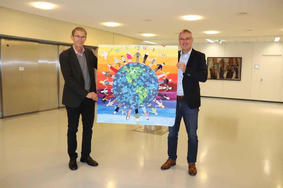 (Foto Landratsamt Rhein-Neckar-Kreis): Welches Motiv wirbt 2019 für den Volkstrauertag? Gewonnen hat das Plakatmotiv der Klassen die 4a und 4b der Schillerschule in Nußloch. Der Vorsitzende des Kreisverbands Rhein-Neckar, Bürgermeister Michael Kessler, und Vorstandsmitglied Bürgermeister Andreas Metz präsentieren das Siegerplakat.