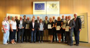 Die Vorsitzenden der 18 LEADER-Aktionsgruppen Baden-Württembergs mit Minister Peter Hauk MdL (8.v.r.) und Bürgermeisterin Sarina Pfründer (7.v.r.) Quelle: MLR
