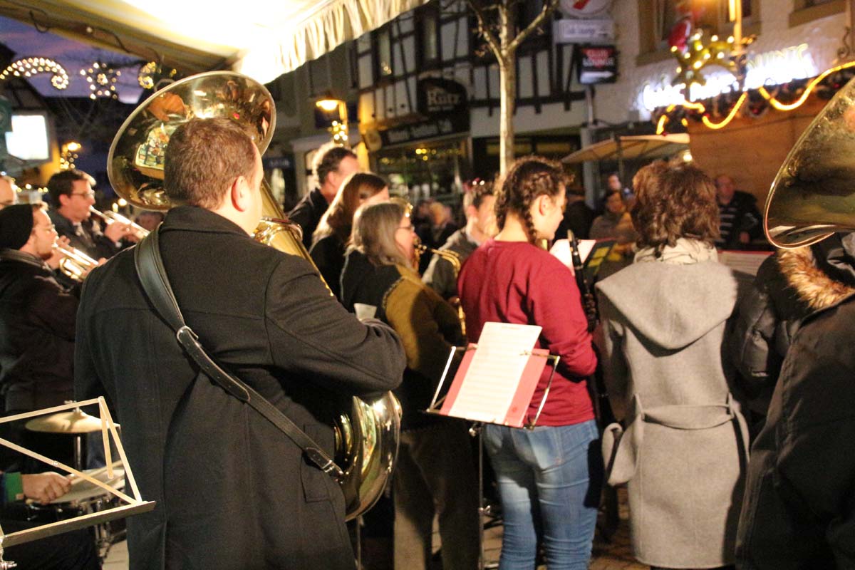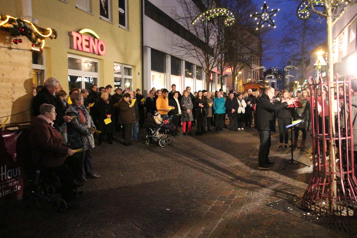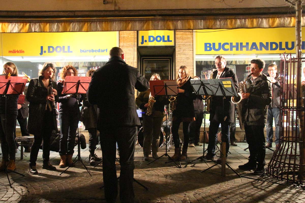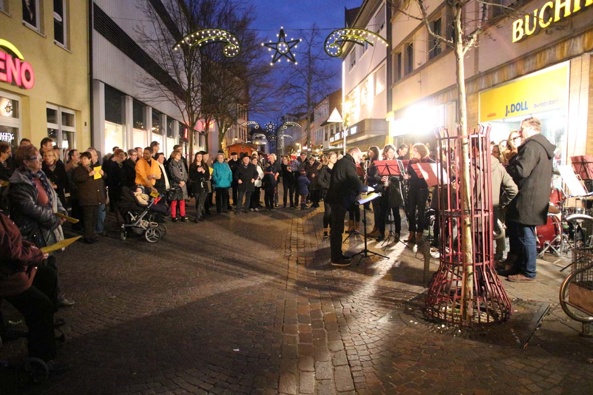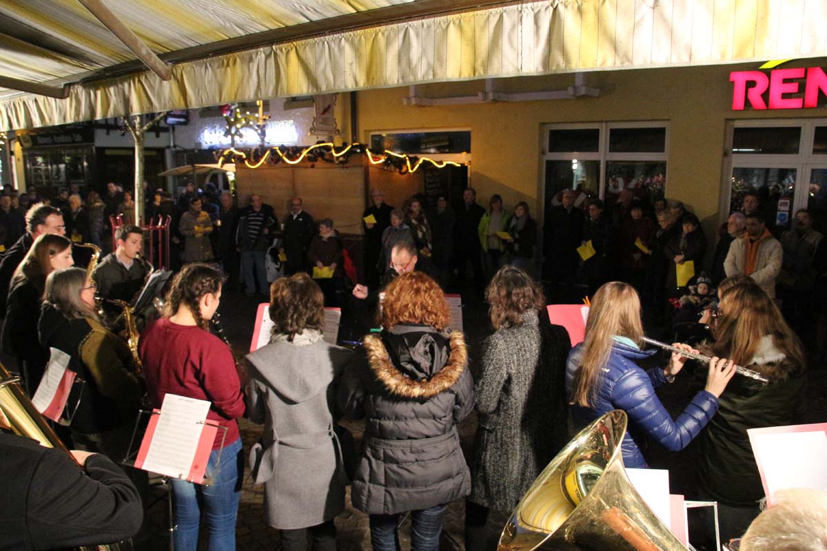 IMG_7143(cr) Keine Weihnacht ohne die Stadtkapelle Sinsheim. Dies hat einfach eine Tradition. Und so trifft sich die Bevölkerung doch gerne zum gemeinsamen Singen von Weihnachtsliedern. Das muss man den Musikern der Stadtkapelle mehr als hoch anrechnen, sie opfern ein wenig ihrer Freizeit um einfach Weihnachtsfreude zu verbreiten. NAtürlich darf auch ein wenig Glühwein nicht fehlen und dafür sorgte sich die Buchhandlung Doll. Einen riesen Dank für diese tolle Tradition.