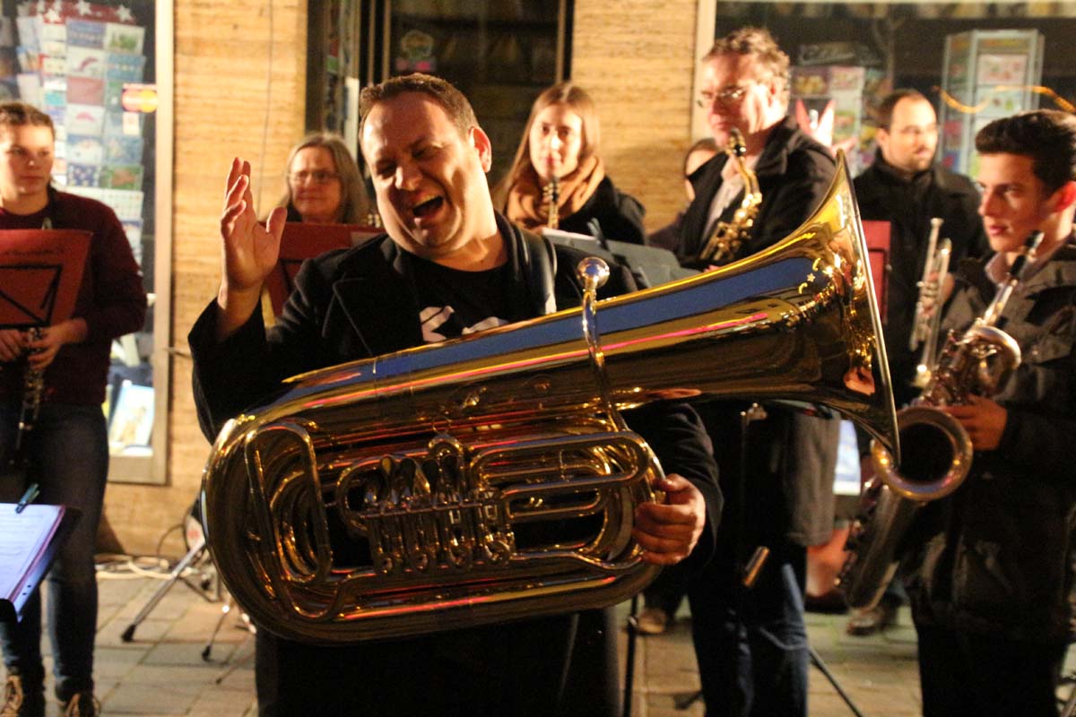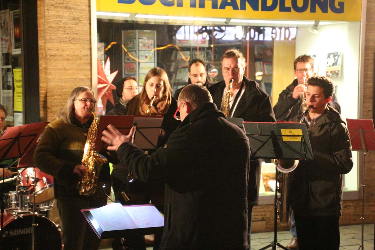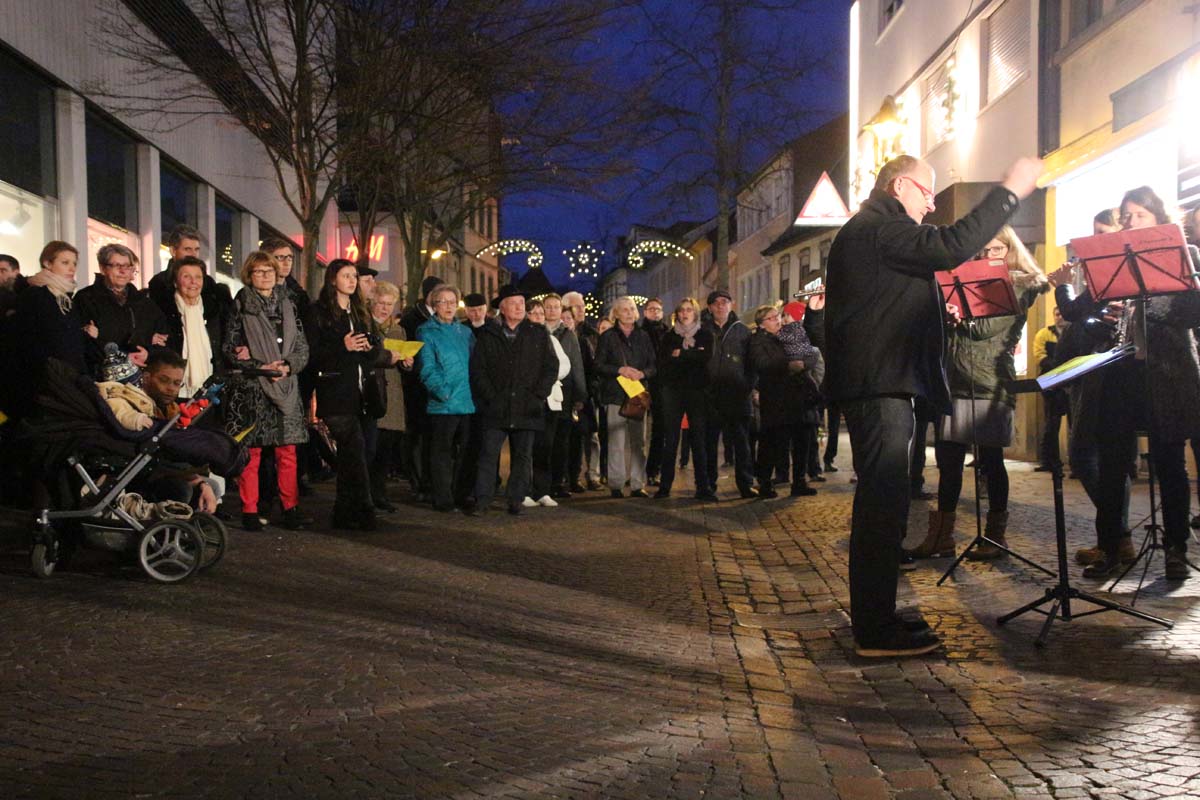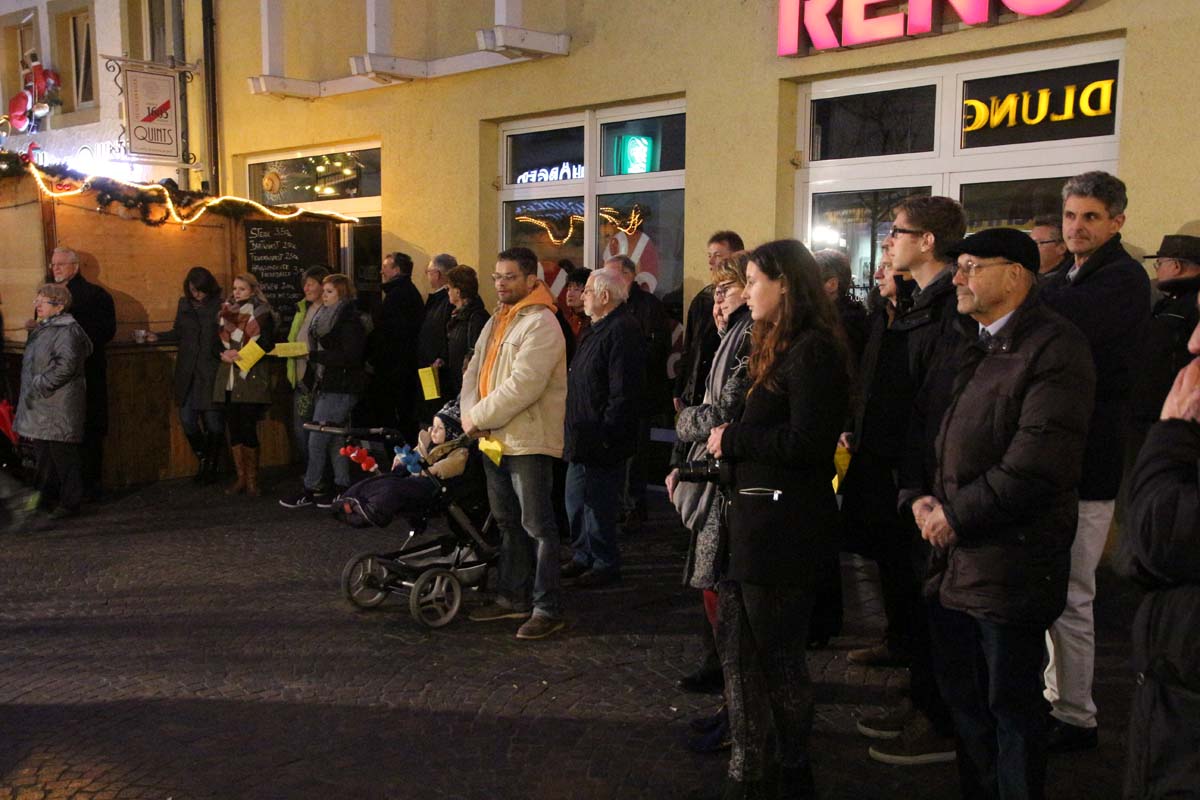 IMG_7143(cr) Keine Weihnacht ohne die Stadtkapelle Sinsheim. Dies hat einfach eine Tradition. Und so trifft sich die Bevölkerung doch gerne zum gemeinsamen Singen von Weihnachtsliedern. Das muss man den Musikern der Stadtkapelle mehr als hoch anrechnen, sie opfern ein wenig ihrer Freizeit um einfach Weihnachtsfreude zu verbreiten. NAtürlich darf auch ein wenig Glühwein nicht fehlen und dafür sorgte sich die Buchhandlung Doll. Einen riesen Dank für diese tolle Tradition.