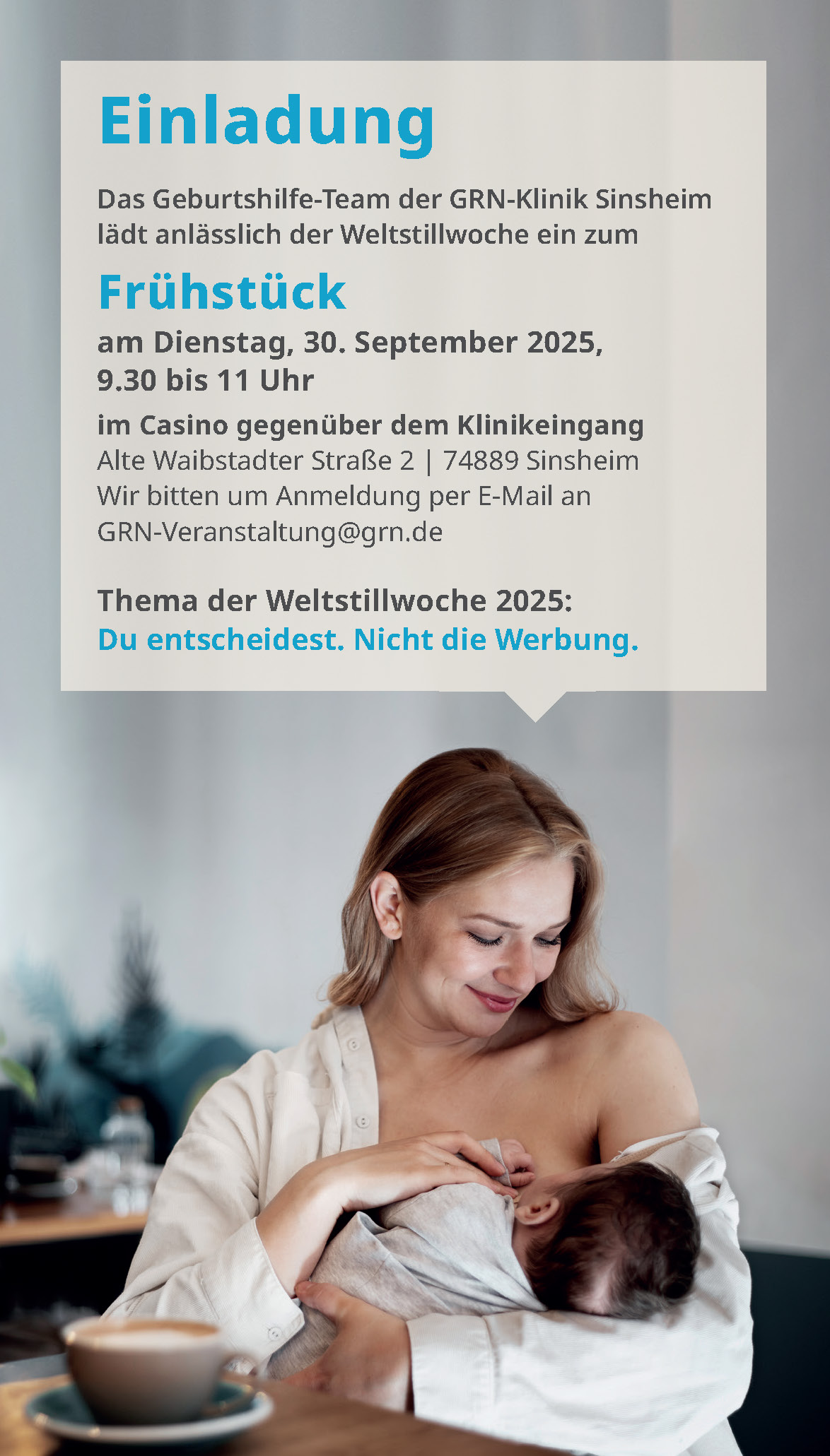 Anlässlich der Weltstillwoche lädt das Geburtshilfe-Team der GRN-Klinik Sinsheim am Dienstag, 30 September 2025 von 9:30 Uhr bis 11 Uhr sowohl stillende wie nicht stillende Mütter und frischgebackene Eltern sowie auch Schwangere zum Frühstück ins Casino (gegenüber der Klinik) ein.