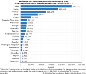 In Baden-Württemberg leben rund 931 000 Personen, die die Staatsangehörigkeit eines der insgesamt 23 ausländischen Teilnehmerländer der Fußballeuropameisterschaft 2021 besitzen.1 Damit kann, so das Statistische Landesamt Baden-Württemberg, jede zweite Person mit ausländischer Staatsbürgerschaft in Baden-Württemberg mit ihrer Nationalmannschaft »mitfiebern«.
