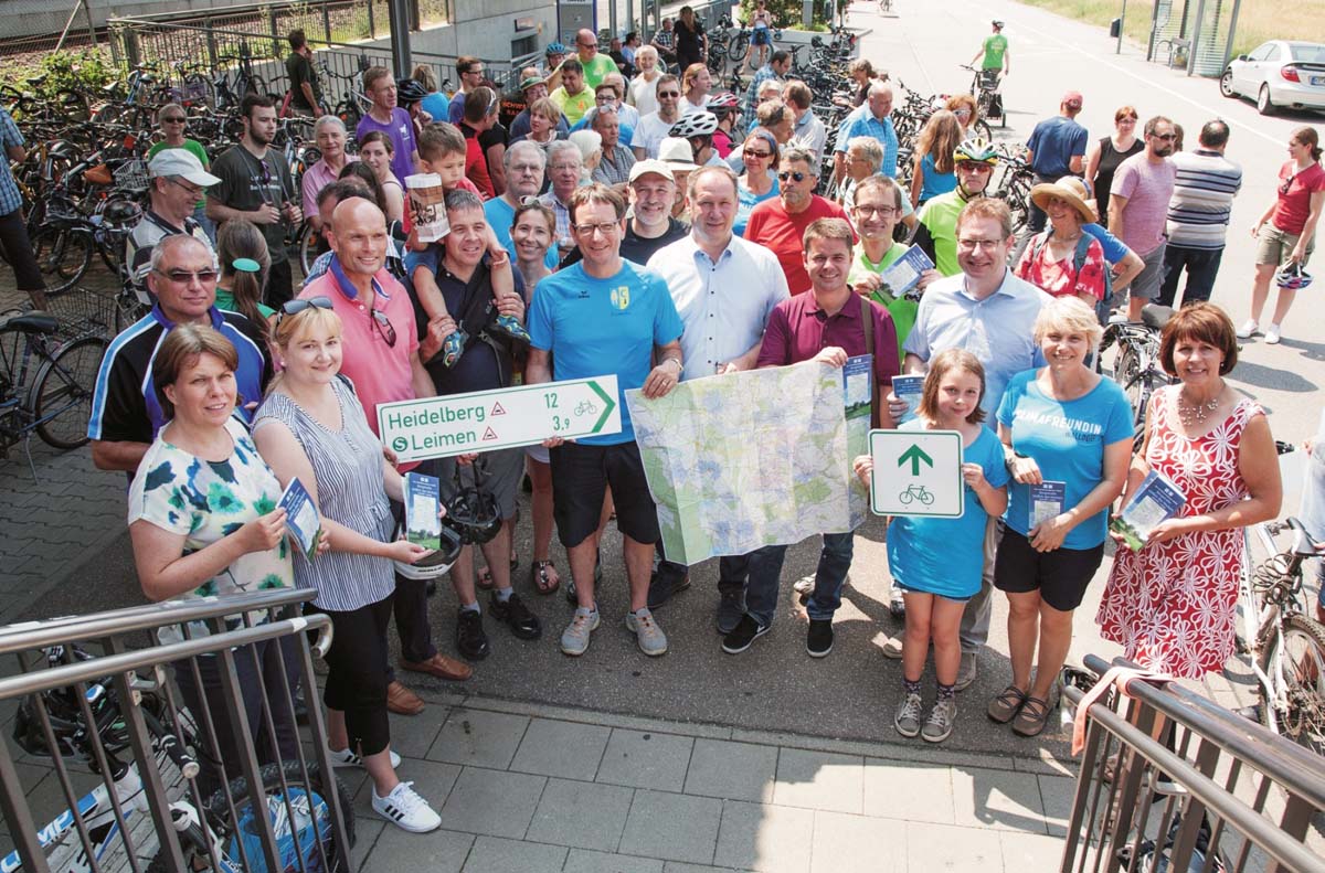 (zg) Zum ersten Mal nimmt der Rhein-Neckar-Kreis an der Aktion „Stadtradeln“ des Klima-Bündnisses teil. Das Besondere ist, dass sich gleich 23 Kommunen aus dem Landkreis angeschlossen haben. „Wir freuen uns sehr, dass zahlreiche Kommunen unserem Aufruf zur Teilnahme gefolgt sind und wir nun gemeinsam ein Zeichen für den Klimaschutz und für den Radverkehr setzen“, so der Erste Landesbeamte des Rhein-Neckar-Kreises, Joachim Bauer. Deshalb gab es auch eine gemeinsame Auftaktveranstaltung, die am Samstag, 9. Juni, in Walldorf stattfand. Die anwesenden Bürgermeisterinnen und Bürgermeister sowie der Landrat-Stellvertreter zeigten sich von der Resonanz begeistert, denn zahlreiche Bürgerinnen und Bürgern aus dem Kreis radelten gemeinsam mit ihnen vom Bahnhof Wiesloch-Walldorf auf den Spargelmarkt nach Walldorf.