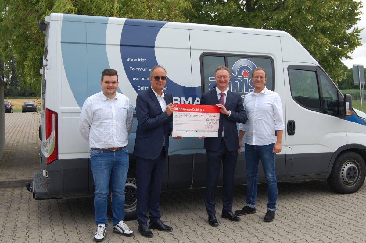 Gemeinsam mit Kunden und Geschäftspartnern unterstützt die AMIS Maschinen Vertriebs GmbH die Fluthilfe der Sparkassen mit einer Spende in Höhe von 6.500 Euro. Unser Bild zeigt (v. l. n. r.) Benjamin Ottenthal, Geschäftsführer Thomas Ottenthal, Norbert Grießhaber, Vorstandsvorsitzender Sparkasse Kraichgau, und Lucas Maulbetsch.