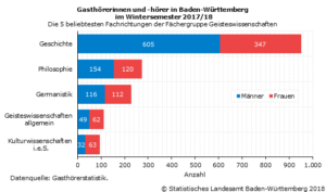 Im Wintersemester 2017/18 belegten nach Angaben des Statistischen Landesamtes insgesamt 4 111 Gasthörerinnen und -hörer an den baden-württembergischen Hochschulen Lehrveranstaltungen1. Damit stieg die Anzahl der Gasthörerinnen und -hörer im Vergleich zum Wintersemester 2016/17 um gut 7 %. Dies war der höchste Anstieg seit dem Wintersemester 2006/07. Nach der Universität Freiburg (844) meldeten die Universitäten in Stuttgart (761) und Heidelberg (596) die meisten Gasthörerinnen und -hörer. Die Anzahl der Gasthörer (2 293) überstieg, wie in den Vorjahren auch, die Anzahl der Gasthörerinnen (1 818). Der Frauenanteil lag damit bei gut 44 %.