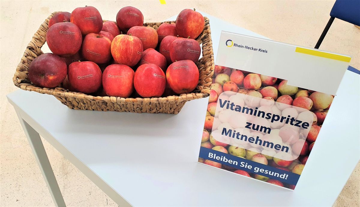 (zg) Ganz nach dem englischen Sprichwort „an apple a day keeps the doctor away“ konnten sich die Besucherinnen und Besucher am Mittwoch, den 26. Mai 2021, in den drei Impfzentren, die das Landratsamt Rhein-Neckar-Kreis im Auftrag des Landes Baden-Württemberg betreibt, über eine besondere Stärkung freuen. Nach erfolgreicher Impfung erhielt jeder Impfling beim Checkout eine gesunde „Vitaminspritze“ in Form eines Apfels. Reich an Vitaminen und Mineralstoffen ist der Apfel ein gesunder Energielieferant und der perfekte Snack für zwischendurch. Insgesamt 2000 Äpfel wurden bei der Aktion im zentralen Impfzentrum in Heidelberg und in den Kreisimpfzentren in Sinsheim und Weinheim verteilt.