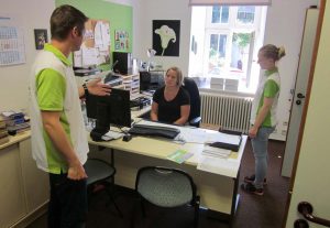 (zg) Unter dem Motto „Deutschland bewegt sich“ erhielt die Stadtverwaltung Neckarbischofsheim am 19.07.2017 Besuch von der Barmer. Zunächst wurde jeder Arbeitsplatz der Beschäftigten im Rathaus begutachtet und dementsprechend eingestellt, sodass eine gesündere Sitzhaltung verbunden mit einer korrekten Schreibhaltung, ermöglicht werden konnte. Um vor allem späteren Rückenbeschwerden, Muskelverspannungen und Durchblutungsstörungen in den Beinen und Fingern vorzubeugen, zeigten die Physiotherapeutin Frau Ungemach und der Barmer-Mitarbeiter Herr Hundemer allen Rathausbeschäftigten ein umfangreiches Bewegungsprogramm.