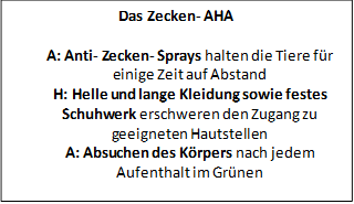 Daher empfiehlt es sich, beim Aufenthalt in der Natur lange helle Kleidung zu tragen. Lange Hosenbeine und Ärmel verlängern die Strecke, die die Zecke zurücklegen muss, um eine geeignete Stelle zu finden. Und auf heller Kleidung kann man die braun-schwarzen Tiere schneller sehen und entfernen, bevor sie zustechen. Auch sogenannte „Zeckensprays“ können helfen, sich die Tiere vom Leib zu halten. „Die Wirkstoffe in den Sprays sorgen dafür, dass die Zecke nicht mehr erkennt, dass es sich um ein passende ,Mahlzeit‘ handelt und sich wieder abfallen lässt“, erklärt Winter.