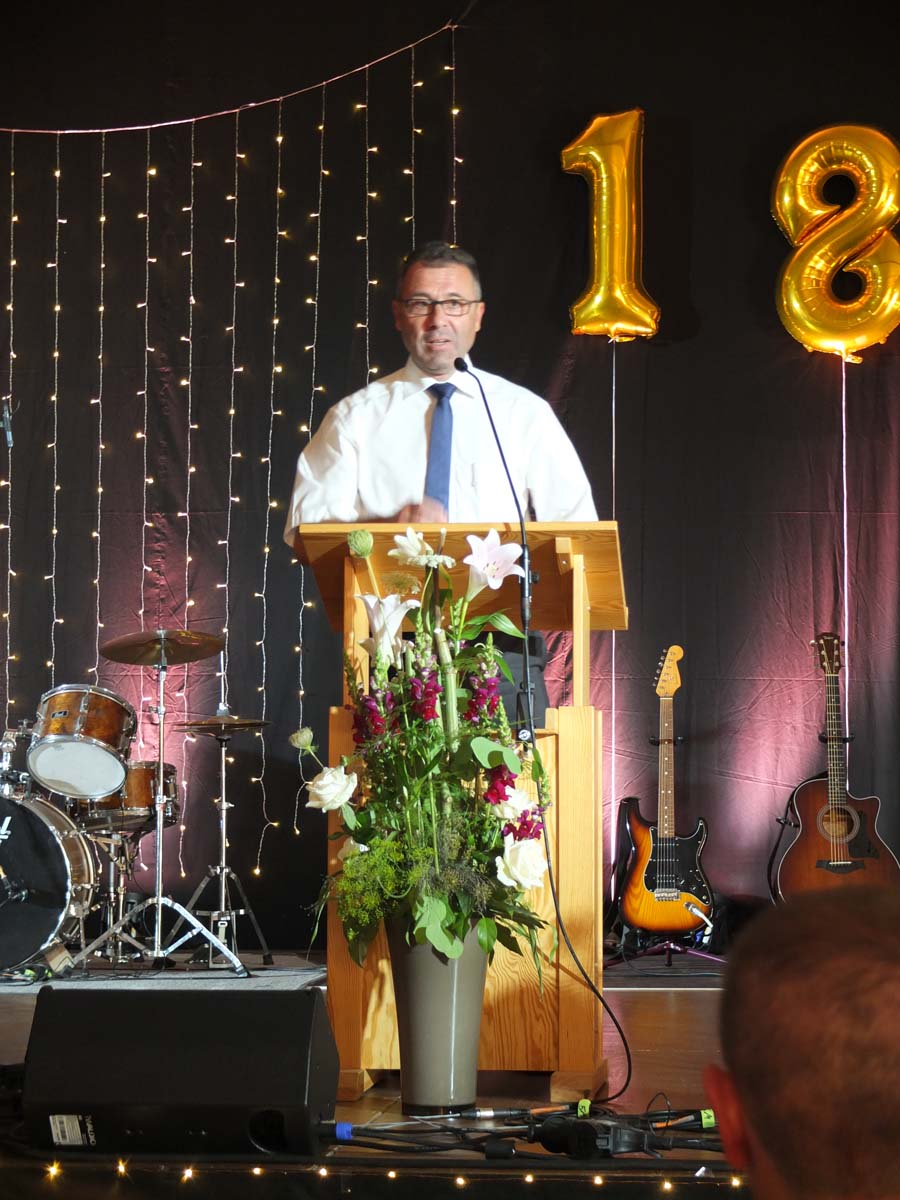 Aber es gibt ein Rezept für Glück. Mit diesem Zitat von Eckert von Hirschhausen entließ Schulleiter Holger Gutwald-Rondot die 128 Abschlussschüler und Abschlussschülerinnen der Kraichgau-Realschule. Ebenso bescheinigte er den Absolventen mit ihrem Zeugnis am heutigen Abend die Eintrittskarte für das vielfältige Sinsheimer Bildungsangebot gelöst zu haben. Etwa ein Drittel der 128 Schüler und Schülerinnen wird eine Ausbildung beginnen und zwei Drittel werden auf weiterführende Schulen gehen, wie eine Blitzumfrage ergab. Zum vierten Mal fand die Abschlussfeier in der liebevoll dekorierten Sporthalle der Schule statt, da die Stadthalle erst wieder 2020 als Ort für die Abschlussfeier genutzt werden kann, so Herrn Oberbürgermeister Jörg Albrecht, der wieder sehr gerne, wie er ausdrücklich in seiner Rede betonte, den Preis der Stadt Sinsheim verlieh.