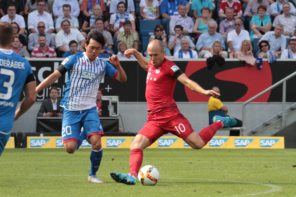 (hjj) Unerwartet stark begann die TSG – überraschend für die Bayern erzielte Kevin Volland schon nach 9,3 Sekunden das 1 : 0 . Rekord eingestellt !! Einen Querpass von David Alaba ahnte der Hoffenheimer Youngster und bezwang den überraschten Manuel Neuer. In einem packenden, keineswegs überlegenen Spiel, der Bayern, wie allgemein erwartet wurde, bot die TSG Paroli und hatte anfangs sogar mehr Spielanteile. Kurz vor der Pause, staubte Thomas Müller, mit einem Kniestoß ab und erzielte so den Ausgleich. Nach der Pause, vor ausverkauftem Hause mit 30.150 Zuschauern, ging es munter weiter. Durch einen Freistoß, von Jerome Boateng mit der Hand abgewehrt, war ein Strafstoß fällig, der von Eugen Polanski an den Pfosten gesetzt wurde, nachdem Manuel Neuer die üblichen Spielchen, die im internationalen Fußball Gang und Gäbe sind, Polanski in der Konzentration gestört hat. Nun wurde es zusehends härter, der Schiri, meines Erachtens hervorragend, hatte aber zu keiner Zeit Probleme mit der Leitung des Spiels. Kurz vor Spielende erzielten die Bayern mit Robert Levandowski, den Siegtreffer zum 1 : 2.