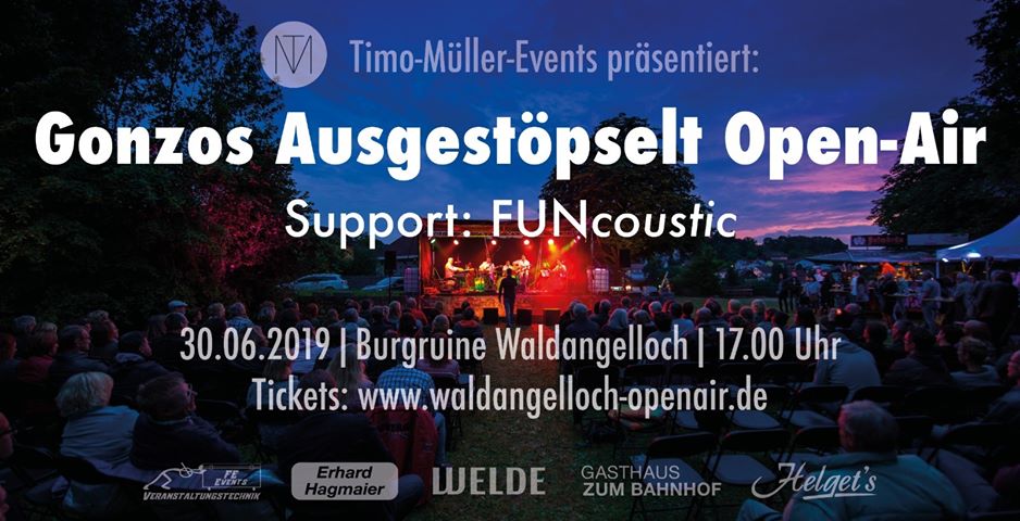 (zg) Am Sonntag, den 30 Juni 2019 gibt es auf der alten Burgruine in Waldangelloch etwas Besonderes zu erleben: Zum zweiten Mal treffen sich hier sechs Vollblutmusiker, rund um den überregional bekannten Michael „Gonzo“ Nowak, um unter freiem Himmel das Beste der außerordentlich erfolgreichen Akustik-Reihe eines bekannten Fernsehsenders auf die Bühne zu bringen. Ob Eric Clapton, Rod Steward, Nirvana oder deutsche Interpreten wie Unheilig oder Udo Lindenberg – alle werden sie an diesem Abend von einer hochkarätig besetzten Band zelebriert werden. Ganz im Vorbild der weltbekannten Konzertreihe wird das Konzert in besonderer Atmosphäre, bestuhlt mit freier Platzwahl, stattfinden. Dieses Jahr zum ersten Mal dabei ist die Band „FUNcoustic“, die sich im Kreis Bad Schönborn bereits großer Beliebtheit erfreut. Unter dem Motto 100% acoustic, 100% handmade and 100% fun, werden sie ab 17.00 Uhr den Startschuss für einen Abend geben, der Ihnen in Erinnerung bleiben wird.