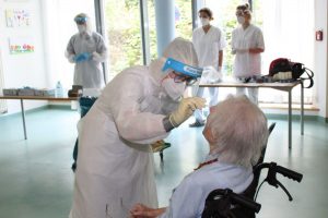 Die Testung lief dank der guten Organisation seitens des Gesundheitsamts sowie der Heimleitungen und Mitarbeiter vollkommen reibungslos – und das trotz der enormen logistischen Herausforderung. Im GRN-Betreuungszentrum Sinsheim beispielsweise waren zwei getrennte Teststationen für den Bereich Pflege und Eingliederungshilfe im Freien aufgebaut worden, wie Birgit Bizer, Heimleiterin in Sinsheim, erläutert: „Die Aktion war von unserem Team gut organisiert worden, und unsere Mitarbeiterinnen und Mitarbeiter auf den Wohnbereichen hatten die Bewohner optimal vorbereitet. Diese haben erstaunlich diszipliniert mitgemacht, so dass wir sogar schneller als geplant mit der Testung fertig waren.“