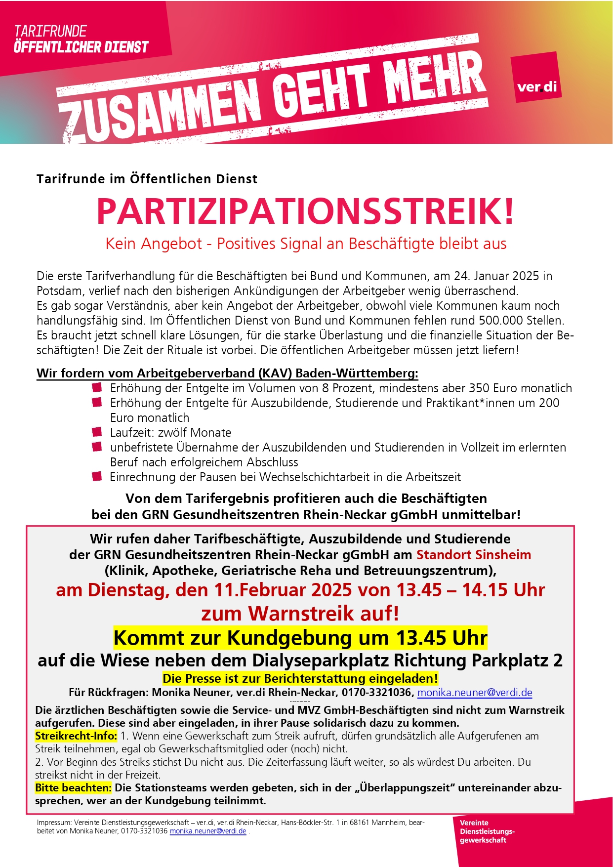 Die Gewerkschaft ver.di hat die Beschäftigten der GRN-Gesundheitseinrichtungen zu Warnstreiks aufgerufen. Am 10. Februar finden Arbeitsniederlegungen in Schwetzingen und Eberbach statt, am 11. Februar in Sinsheim. Hintergrund ist die Forderung nach einem verhandlungsfähigen Angebot in der laufenden Tarifrunde des öffentlichen Dienstes.