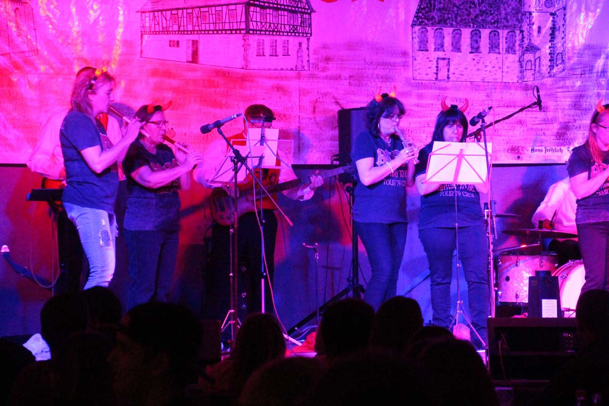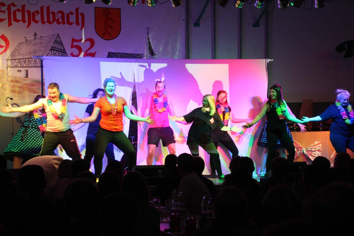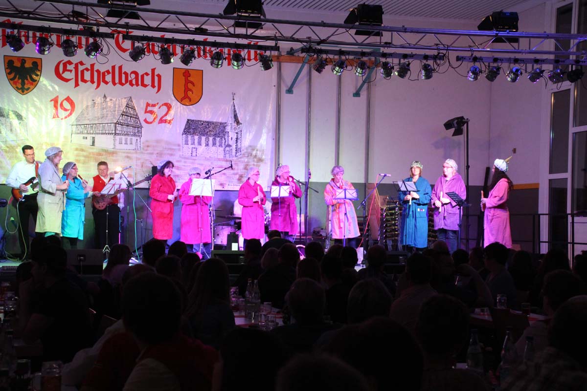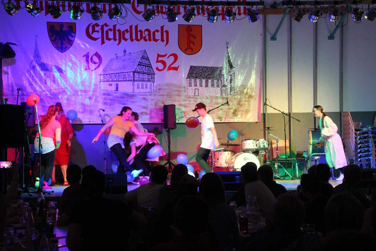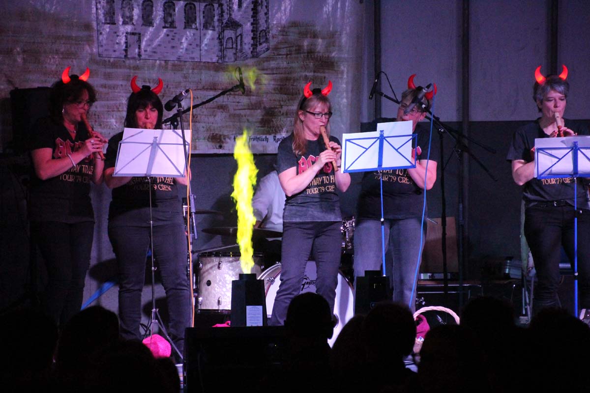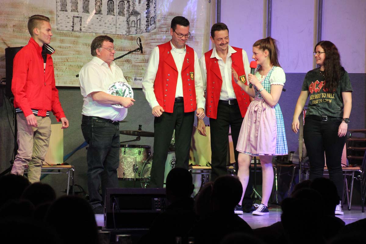 Das erste Highlight folgte mit der Eschelbacher Tagesschau, lokale Nachrichten des vergangenen Jahres gespickt mit witzigen Bildern und Kommentaren. Nach einer kurzen Pause folgte die wohl aussergewöhnlichste Hitparade. Hier hatte sich der Musikverein wirklich richtig was einfallen lassen. Hier musste sich am Ende das fantastische Männerballett den Blockflötenfrauen mit ihrem Heissluftgebläse geschlagen geben. Denn ihre AC/DC Einlage war einfach unschlagbar. Aber auch alle anderen Teilnehmer der Hitparade lieferten eine grossartige Show. Unter allen Teilnehmern zur Abstimmung des Hitparadenergebnis wurden neun tolle Preise ausgelost.