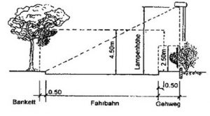 – An Straßen dürfen bis zu einer Höhe von 4 m Äste nicht in die Fahrbahn ragen. Über der gesamten Fahrbahn muss ein Lichtraum von 4,5 m frei bleiben. Der Übergang von 4 m Höhe auf 4,5 m ist in schräger Richtung innerhalb eines 0,5 m breiten Geländestreifens herzustellen (siehe Abbildung).