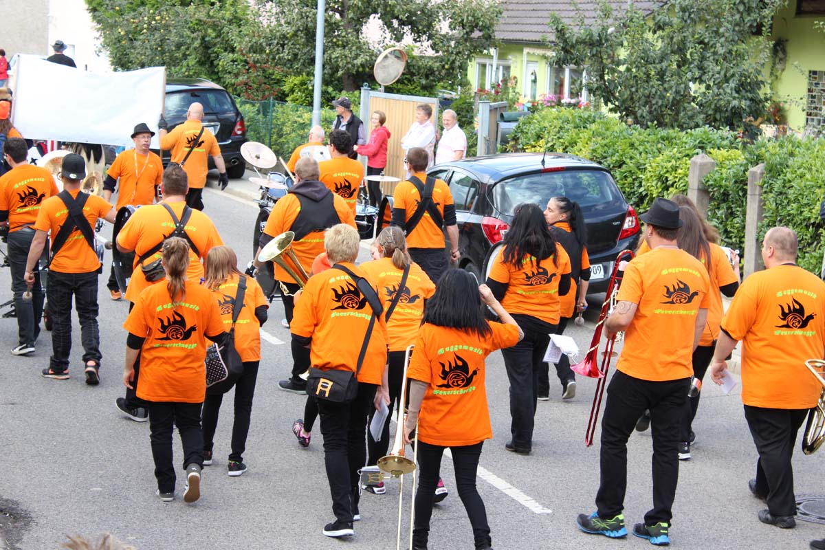 Das erste Mal traten die Guggemusiker dann am 20.09.15 beim Kerweumzug in Waldangelloch auf. Mit einfachen, aber stimmungsvollen Liedern unterhielten die„Feuerschnegge“ die Zuschauer am Straßenrand bei herrlichem Wetter.