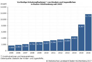 Ein solches Eingreifen der Jugendämter war nach Feststellung des Statistischen Landesamtes im Jahr 2016 in Baden‑Württemberg für 11 714 Kinder und Jugendliche notwendig (2015: 8 367 Kinder). Das bedeutet gegenüber dem Vorjahr eine Zunahme um 40 % oder 3 347 Kinder. Wie bereits im letzten Erhebungsjahr, resultiert der Anstieg bei den vorläufigen Schutzmaßnahmen insbesondere aus den unbegleiteten Einreisen Minderjähriger aus dem Ausland.