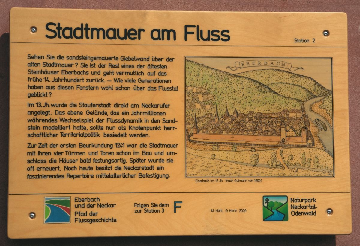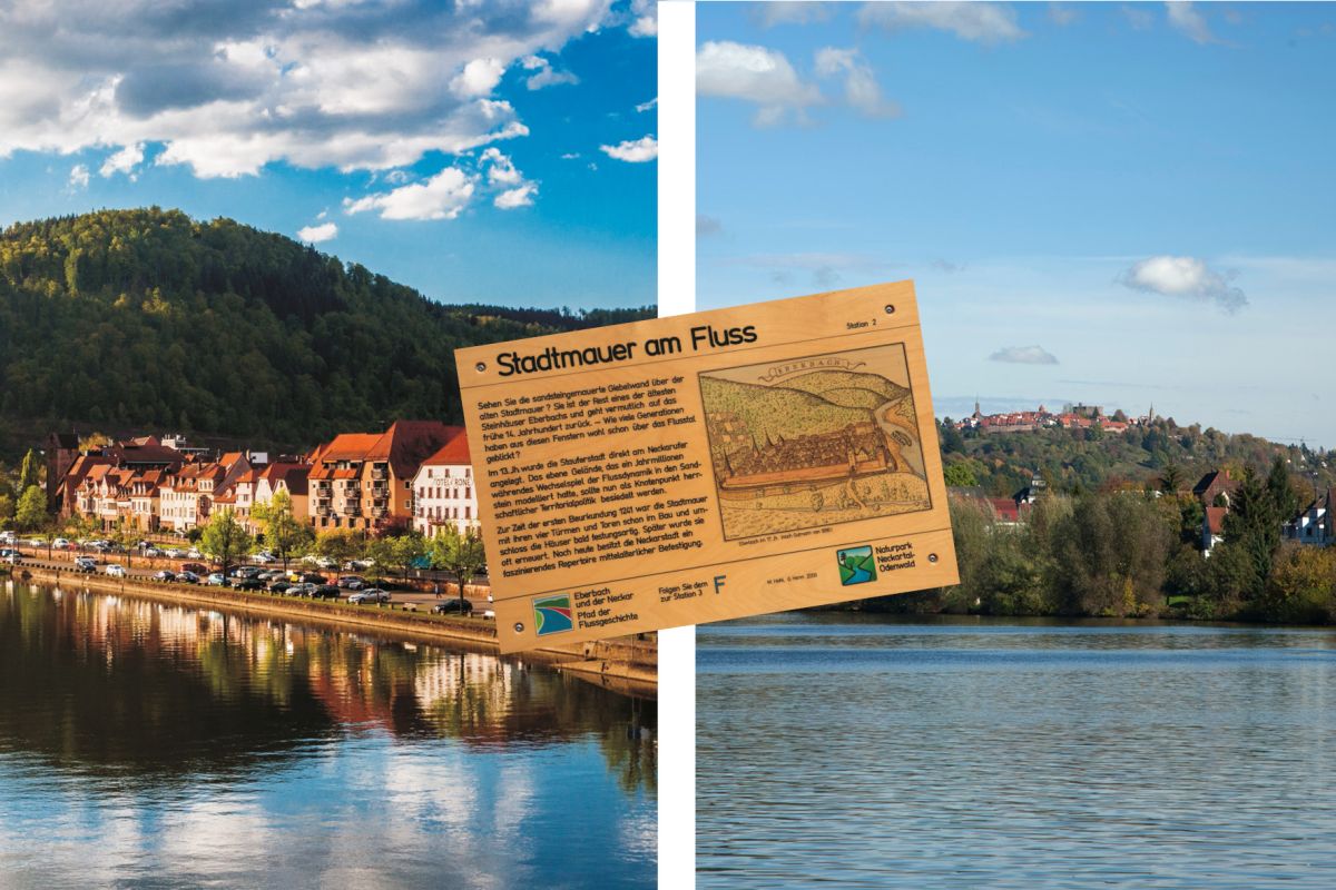 Auf einem etwa zehn Kilometer langen, landschaftlich attraktiven Rundweg durchstreift man einen Landstrich voller Überraschungen. Auf 15 Tafeln wird die geologische und flussgeschichtliche Entwicklung des Neckars eindrucksvoll und verständlich dargestellt. Die Route beginnt am altehrwürdigen Thalheimschen Haus, Sitz des Eberbacher Naturparkzentrums in der Kellereistraße, und verläuft zunächst durch die Altstadt. Vier Tafeln im mittelalterlichen Stadtbild zeigen, dass Eberbach immer eng mit dem Fluss verbunden war und bis heute noch ist. Dann führt der Naturpark-Pfad bergauf in die herrliche Kulturlandschaft auf den Breitenstein. Hier entdeckt man Umlaufberge, die einst von Neckarschleifen umzogen wurden, sowie weitere frühere Talböden des Neckars. Man erkennt, warum das markante Eberbacher Neckarknie Überbleibsel einer Flussanzapfung ist und wie der junge Neckar sein Einzugsgebiet im Lauf der Jahrmillionen sukzessive erweitern konnte.