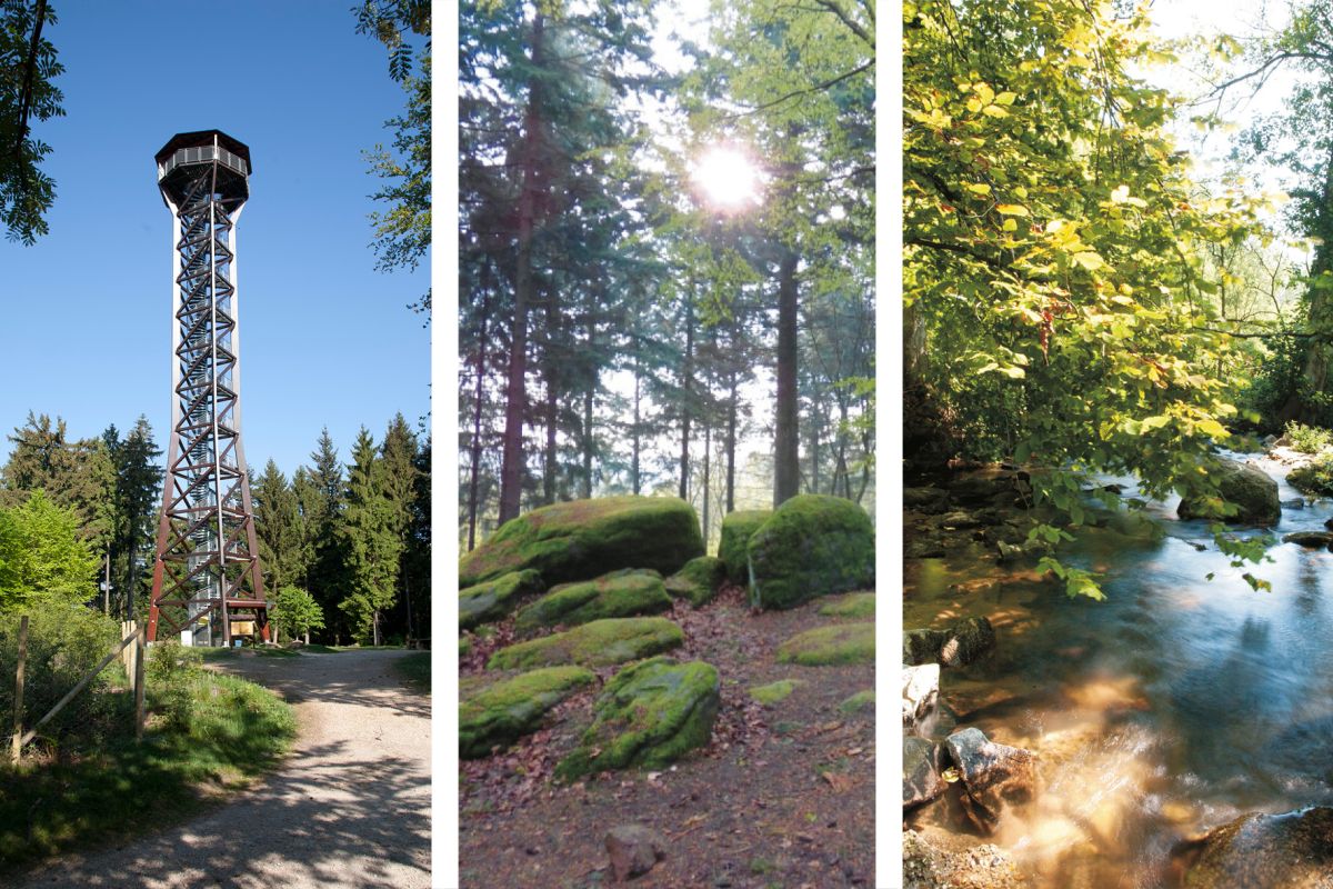 Collage (Quelle: Landratsamt Rhein-Neckar-Kreis, Burkhardt, Unger): Wie wäre es mit einer Mountainbike-Tour rund um den Wilhelmsfelder Teltschikturm, einer Wanderung am Geoparkpfad „Steine, Schluchten und Sagen“ bei Weinheim und Schriesheim oder einem Tagesausflug ins herrliche Steinachtal?