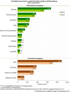 Die hiesigen Landwirte erwirtschafteten 2015 gemäß der im Statistischen Landesamt Baden‑Württemberg erstellten Regionalen Landwirtschaftlichen Gesamtrechnung mit pflanzlichen und tierischen Erzeugnissen sowie landwirtschaftlichen Dienstleistungen einen Produktionswert (zu Erzeugerpreisen) in Höhe von insgesamt rund 4,2 Milliarden (Mrd.) Euro. Im Vergleich zum Vorjahr entsprach dies einem Rückgang von annähernd 9 Prozent oder rund 410 Millionen (Mill.) Euro.