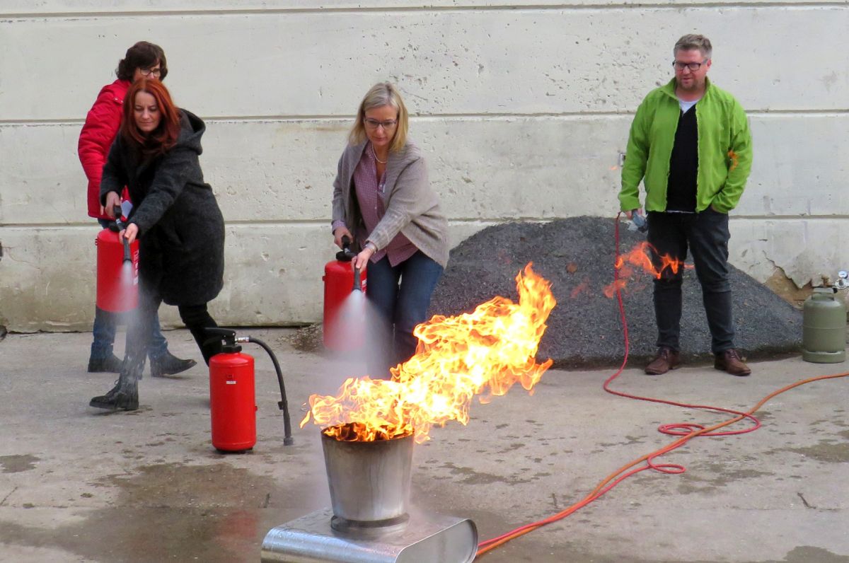 GRN-Mitarbeiterinnen übten beim zweiten Fortbildungstag unter Anleitung eines Mitarbeiters der Firma Mesino, Gesellschaft für Arbeitsmedizin und Arbeitssicherheit, die korrekte Handhabung eines Feuerlöschers. (Foto: GRN)