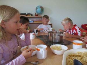 Zuerst musste, nachdem die Mamas verabschiedet waren, für jeden ein Schlafplatz gefunden und vorbereitet werden. Gleich danach stärkten wir uns mit leckeren Spaghetti und Tomatensauce, bevor wir den Abend mit verschiedenen Spielen und viel Spaß gestalteten.