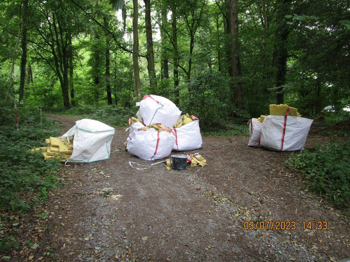 Vor Ort stellten die Polizisten insgesamt sieben große Abfallsäcke inmitten des Planweges liegend fest. In den Säcken befanden sich schätzungsweise sieben qm³ gebrauchte Dämmwolle.