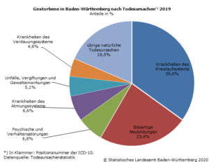 Im Vergleich zu 2018 stieg die Zahl der Sterbefälle insgesamt im Jahr 2019 geringfügig um rund 400 oder 0,4 % an. Differenziert nach Todesursachen zeigten sich leicht abweichende Entwicklungen. So sank die Zahl der an Herz-Kreislauf-Erkrankungen Gestorbenen entsprechend dem langjährigen Trend leicht um etwa 200 bzw. 0,6 %. Sterbefälle mit der Todesursache bösartige Neubildung nahmen dagegen um 100 oder 0,4 % zu. Für die Todesursache »Grippe« war 2019 wieder ein deutlicher Rückgang zu beobachten. Nachdem die Grippewelle 2018 mehr als 500 Menschen aus Baden-Württemberg das Leben kostete, sank die Zahl der Sterbefälle mit dieser Todesursache um mehr als Hälfte und lag 2019 bei etwa 250.