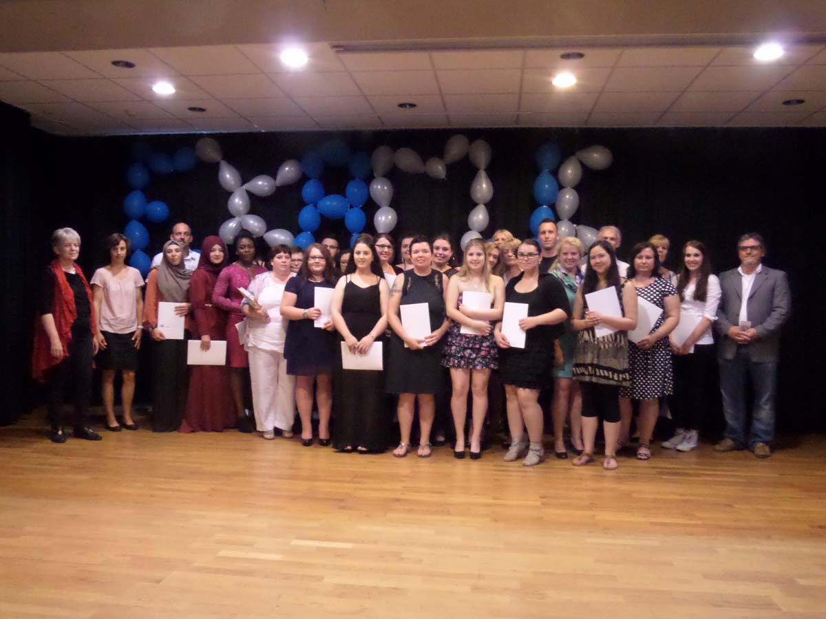 Renate Petermann betonte, dass die frisch examinierten Altenpflegekräfte durch ihre Ausbildung gut auf die Herausforderungen des Pflegealltags vorbereitet seien und dass es nun gelte, dieses Rüstzeug in die Praxis umzusetzen und durch gute Arbeit den Pflegeberuf gesellschaftlich aufzuwerten. Sie hob hervor, dass auch die Schule versuche, durch ihr Angebot mit den gesellschaftlichen Entwicklungen Schritt zu halten, zum Beispiel durch spezielle Seminare zum Interkulturellen Training oder den Grundkurs Kinästhetik. Aber auch das Angebot an traditionellen und neuen Aus- und Weiterbildungsmöglichkeiten im Bereich der Pflege wird ständig erweitert. Dies zeigen die Zweijährige Berufsfachschule für Altenpflegehilfe für Migrantinnen und Migranten, die Zertifizierung nach AZAV für die Ausbildung von Umschülerinnen und Umschülern, die Fachschule für Gerontopsychiatrie oder die Ausbildung von Mentorinnen und Mentoren im Hinblick auf die bevorstehende Generalisierung der Pflegeberufe.