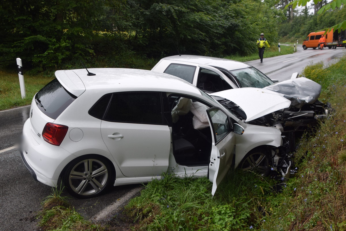 Ersten Ermittlungen zu Folge stießen zwei VW, Golf im Begegnungsverkehr frontal zusammen.