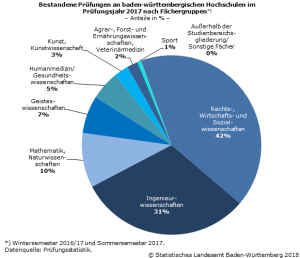 (zg) Im Prüfungsjahr 20171 wurden an den baden-württembergischen Hochschulen 77 061 Abschlussprüfungen erfolgreich abgelegt. Wie das Statistische Landesamt mitteilt, stagnierte die Zahl der Hochschulabschlüsse damit auf dem Vorjahresniveau (77 057). Die starke Zunahme der Absolventinnen und Absolventen in den Prüfungsjahren 2003 bis 2015 setzte sich somit 2017 wie auch 2016 nicht weiter fort2. Der Frauenanteil an den bestandenen Prüfungen betrug 47,7 % (36 723) und lag 0,4 Prozentpunkte über dem Wert des Vorjahres.