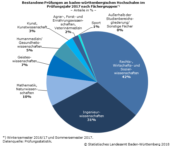 Die meisten Abschlüsse wurden in der Fächergruppe »Rechts-, Wirtschafts- und Sozialwissenschaften« erworben (32 225). Auf den weiteren Plätzen folgten die »Ingenieurwissenschaften« mit 23 930 Abschlüssen, die Fächergruppe »Mathematik, Naturwissenschaften« mit 7 589 und die »Geisteswissenschaften« mit 5 243 bestandenen Prüfungen. Während die Zahl der Absolventinnen und Absolventen in den »Rechts-, Wirtschafts- und Sozialwissenschaften« gegenüber dem Vorjahr um 1 058 Personen (+3 %) anstieg, ging die Zahl in den »Geisteswissenschaften« um 439 (−8 %) zurück. Der Frauenanteil an den bestandenen Prüfungen fiel sehr unterschiedlich aus: In den »Geisteswissenschaften« erlangten Frauen 70 % (3 660), in den »Ingenieurwissenschaften« 22 % (5 310) der Abschlüsse.