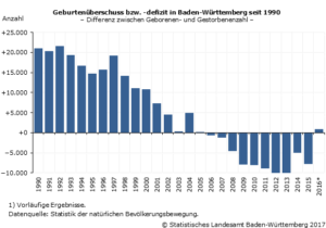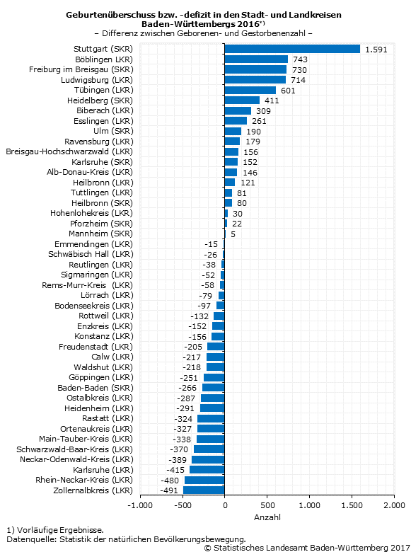 Stadt- und Landkreise: Aufgrund der gestiegenen Geborenenzahlen konnten im vergangenen Jahr immerhin 19 der 44 Stadt- und Landkreise Baden‑Württembergs ein Geburtenplus erzielen; im Jahr zuvor gab es diese günstige Konstellation lediglich in 8 Kreisen. Die Spitzenstellung beim Geburtenüberschuss nahm im Jahr 2016 die Landeshauptstadt Stuttgart ein (1 591 mehr Geborene als Gestorbene), gefolgt vom Landkreis Böblingen (+743) und dem Stadtkreis Freiburg im Breisgau (+730). Dagegen wiesen 25 Stadt- und Landkreise im Südwesten weniger Geborene als Gestorbene auf. Die höchsten Geburtendefizite waren 2016 im Zollernalb- und im Rhein‑Neckar-Kreis sowie im Landkreis Karlsruhe zu beobachten. Die unterschiedliche Bilanz aus der Zahl der Geborenen und der der Gestorbenen in den einzelnen Kreisen wird wesentlich durch die Altersstruktur der Bevölkerung beeinflusst. Aber auch die Geburtenhäufigkeit – also die durchschnittliche Kinderzahl je Frau – und die unterschiedliche Lebenserwartung in den einzelnen Teilräumen bestimmen das Verhältnis von Geburten zu Sterbefällen.