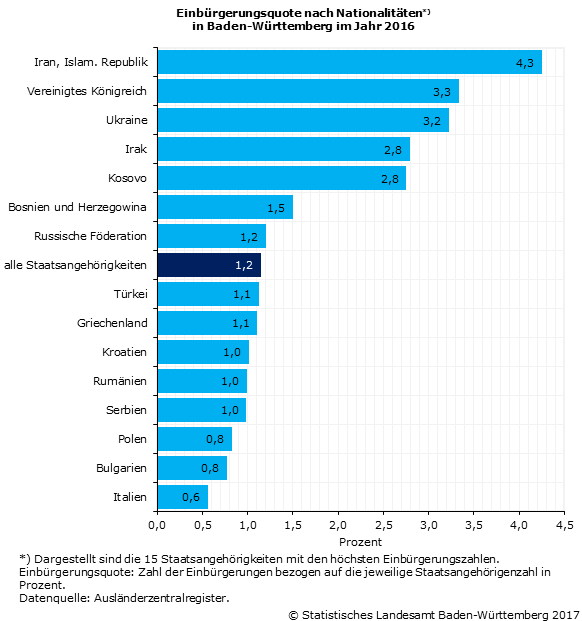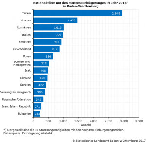 Dass Mitbürger aus der Türkei – absolut betrachtet – in Baden‑Württemberg am häufigsten eingebürgert werden, überrascht wenig, weil diese die größte ausländische Bevölkerungsgruppe bilden. Wird deshalb die Zahl der eingebürgerten Personen auf die jeweilige Bevölkerungsgruppe bezogen, so ergibt sich ein anderes Bild: Die Einbürgerungsquote der türkischen Bevölkerung lag im vergangenen Jahr bei 1,1 Prozent und damit sogar leicht unter derjenigen der Ausländer insgesamt (1,2 Prozent).