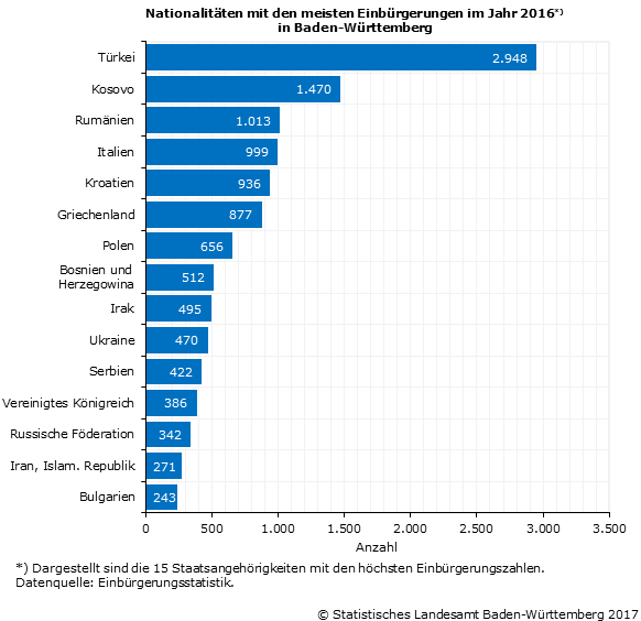 Im vergangenen Jahr wurden in Baden‑Württemberg Ausländer aus insgesamt 140 Nationen eingebürgert. Mit Abstand am häufigsten – wie bereits in den Jahren zuvor – haben Türken (2 948) die deutsche Staatsangehörigkeit erworben; jede sechste Einbürgerung betraf damit Personen mit einer türkischen Staatsangehörigkeit. Es folgten Einbürgerungen von Staatsangehörigen der Republik Kosovo (1 470) und Rumäniens (1 013). Unter den 15 Herkunftsstaaten mit der höchsten Zahl an Einbürgerungen waren 2 asiatische Staaten – Irak und Iran – sowie 13 europäische vertreten. Zu dieser Spitzengruppe zählten auch die Briten: 386 Staatsangehörige des Vereinigten Königreichs ließen sich im vergangenen Jahr einbürgern. Damit hat sich deren Zahl gegenüber 2015 – damals gab es lediglich 68 Einbürgerungen von Briten – mehr als verfünffacht.