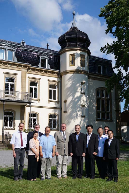 Die Delegation des thailändischen Gesundheitsministeriums mit DMG-Mitarbeitern vor der Zentrale der DMG, Schloss Buchenauerhof