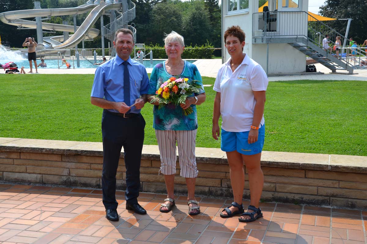 Albrecht überreichte gemeinsam mit Betriebsleiterin Tina Steinrück einen Gutschein für eine Saisonkarte 2016 und einen Blumenstrauß. Aufgrund der schlechten Witterung planschten 2014 insgesamt nur rund 88.000 Besucher im Freibad – dieser Wert wurde 2015 bereits Anfang August „geknackt“.