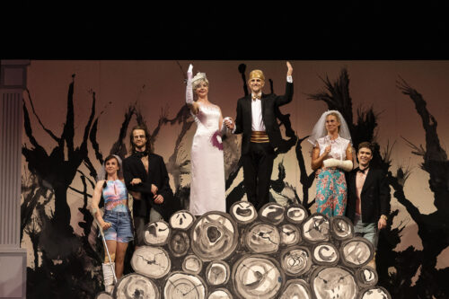 Wenn am Schluss sich alle der Ordnung der Dinge wieder fügen, empfinde ich diese Anpassung viel gruseliger als jeden Geisterspuk.“ Der Wald, den Evelyn Nagel und Ausstatterin Franziska Smolarek auf die Bühne bringen, ist gezeichnet vom Klimawandel, den der Ehestreit von Oberon und Titania ausgelöst hat. Ein unheimlicher Schauplatz für ein sinnliches Verwirrspiel um Träume, Phantasien und Identitäten.