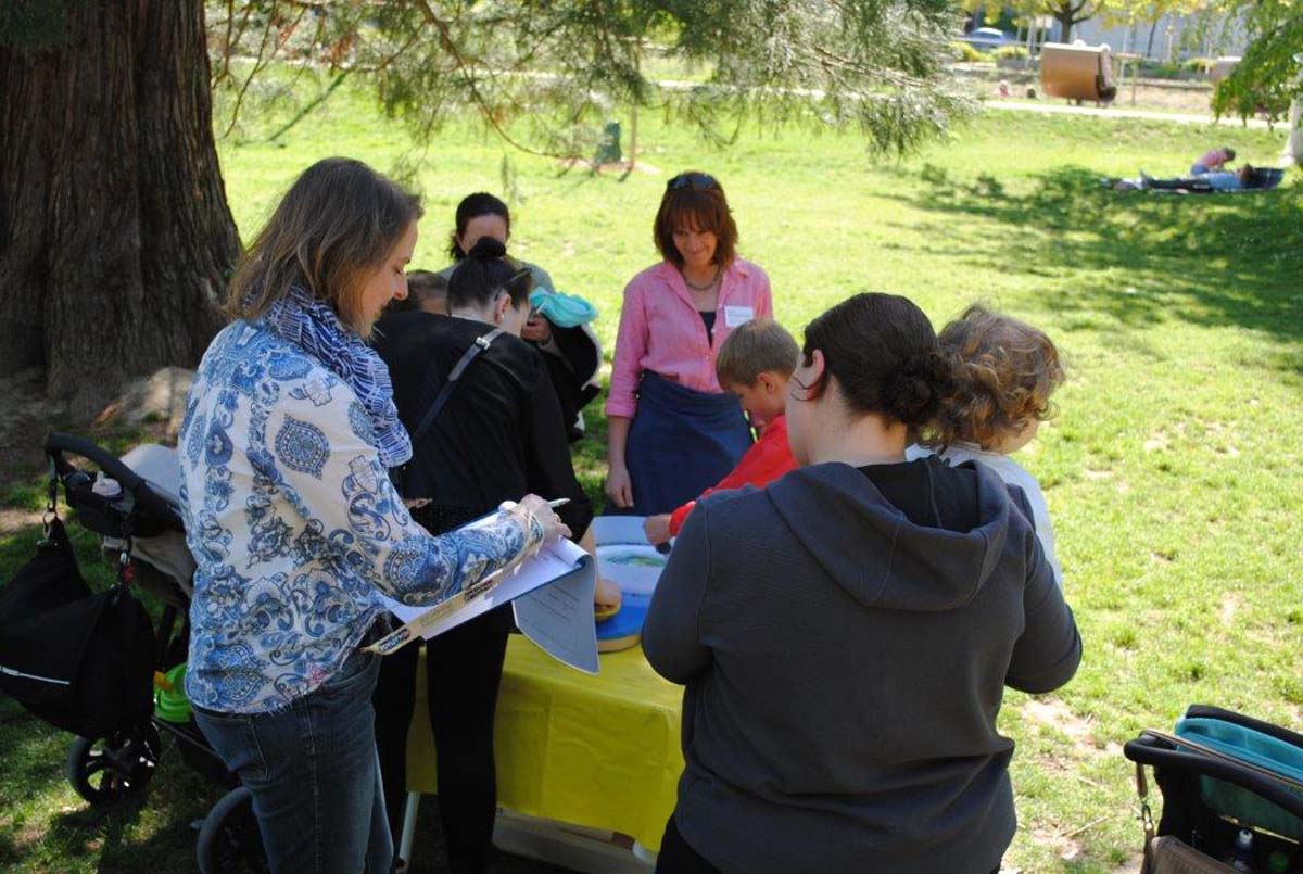 Damit ihren Kindern in der Zeit nicht langweilig wurde, boten Katja Kümmerlin-Müller (städtische Kindertagesstätte Rohrbach), Stefanie Wild und Nicola Junghans (Anpfiff ins Leben) und Gisela Drees mit Team vom Spiel-Mobil im Kraichgau ein anregendes Spielprogramm auf der Wiese an. Unter diesen Bedingungen fiel es leicht, mit Müttern, Omas und Vätern ins Gespräch zu finden. Sie erzählten, wie viele Kinder die Familie zurzeit habe, und warum sie sich gerne in der Bewegungsanlage oder an anderen Plätzen in Sinsheim aufhalten. Fast alle Eltern fühlen sich gut über die Angebote in Sinsheim informiert und finden alles, was sie suchen, im Internet oder Stadtanzeiger.