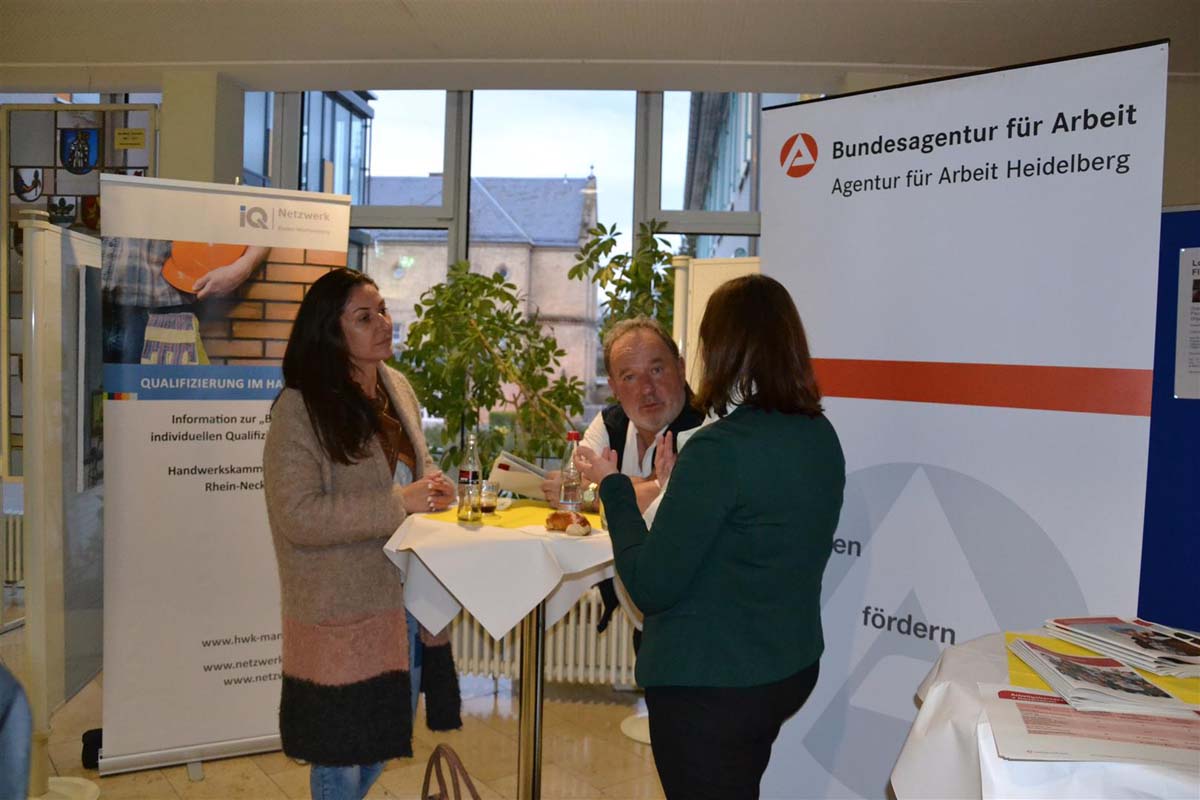 Im Anschluss an die Informationsveranstaltung gab es die Möglichkeit, mit den zentralen Arbeitsmarktakteuren ins Gespräch zu kommen und Antworten auf konkrete Fragestellungen zu erhalten. Die einladenden Organisationen und Unternehmensvertreter standen noch lange im Foyer und tauschten sich bzw. ihre Visitenkarten aus.