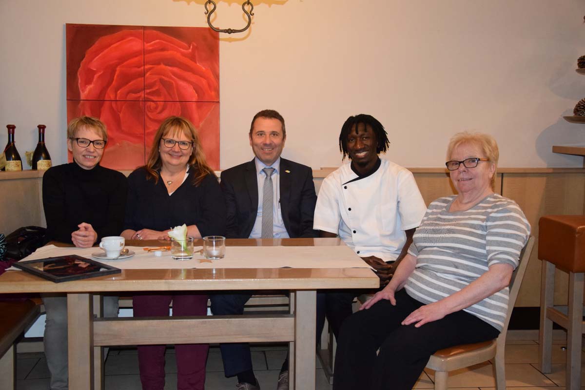 Typisch in der Woche der Vielfalt: OB Jörg Albrecht im direkten Gespräch mit Akteuren im Grünen Baum Rohrbach. (v.l.) Susanne Becker, städtische Integrationsbeauftragte Inge Baumgärtner, OB Jörg Albrecht, Azubi Jamil Ceesay und Senior-Chefin Edda Barth