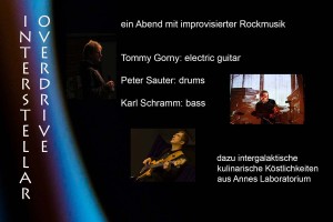 oder wie war das noch im Mittelteil? Ein Abend mit improvisierter Musik mit Tommy Gorny (Gitarre), Karl Schramm (Bass) und Peter Sauter (Schlagzeug). Drei Musiker treffen sich zum Konzert und alles was sie vorher von ihrem Repertoire kennen, sind Anfangs- und Endthema. „Wir haben keine Ahnung, was passieren wird, wir haben in dieser Konstellation noch nie zusammengespielt. Wenn wir Glück haben, erleben wir eine Sternstunde, wenn nicht bleibt nur ein schwarzes Loch. Dieses Konzert ist auf jeden Fall nichts für Feiglinge.“ (Karl Schramm) Lassen wir uns von dem musikalischen Experiment überraschen und geniessen dazu galaktische, kulinarische Köstlichkeiten aus Annes Küche!
