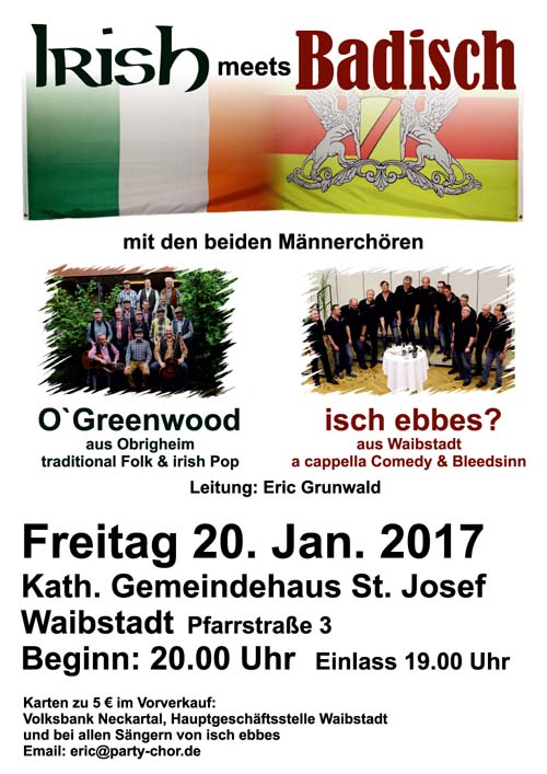 (zg) „Irish meets Badisch“ Das Motto dieses Konzertes verspricht Überraschungen. Wer „Isch Ebbes“ kennt , weis das hier das etwas andere Liedgut präsentiert wird. Zusammen mit dem Chor O’Greenwood aus Obrigheim die sich dem Irischen Liedgut verschrieben haben erlebt ihr alles andere als einen klassischen Liederabend ! Das Obrigheimer Publikum konnte sich davon schon überzeugen .Gerne laden wir Euch am 20.01.2017 um 20.00 Uhr zu einem lockeren ungezwungenen Abend im Josefshaus in Waibstadt ein.