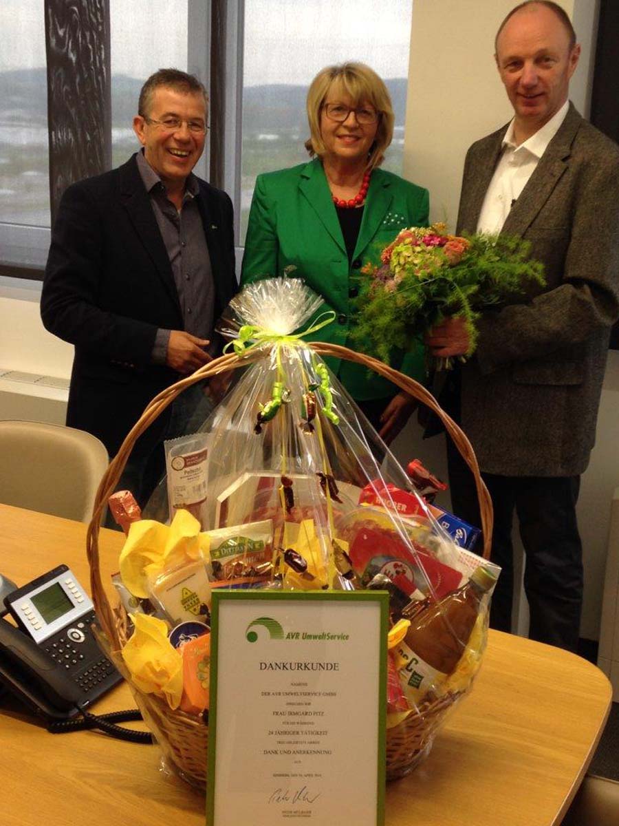 Ihrem letzten Arbeitgeber, der AVR, stellte sie ihre kaufmännischen Fähigkeiten seit September 1991 zur Verfügung. Zunächst im Bereich des allgemeinen Schreibdienstes, später dann im Rechnungswesen und zuletzt im Mahnwesen. „25 Jahre sind eine lange Zeit, heutzutage schon fast etwas Außergewöhnliches. Wir haben Sie und Ihre Arbeit für die AVR immer zu schätzen gewusst und wünschen Ihnen alles Gute für den nächsten Lebensabschnitt“, sagte Geschäftsführer Peter Mülbaier bei der kleinen Feierstunde und bedankte sich namens der AVR sowie der Kolleginnen und Kollegen mit einem Präsentkorb und einer „Dankeschön-Urkunde“.