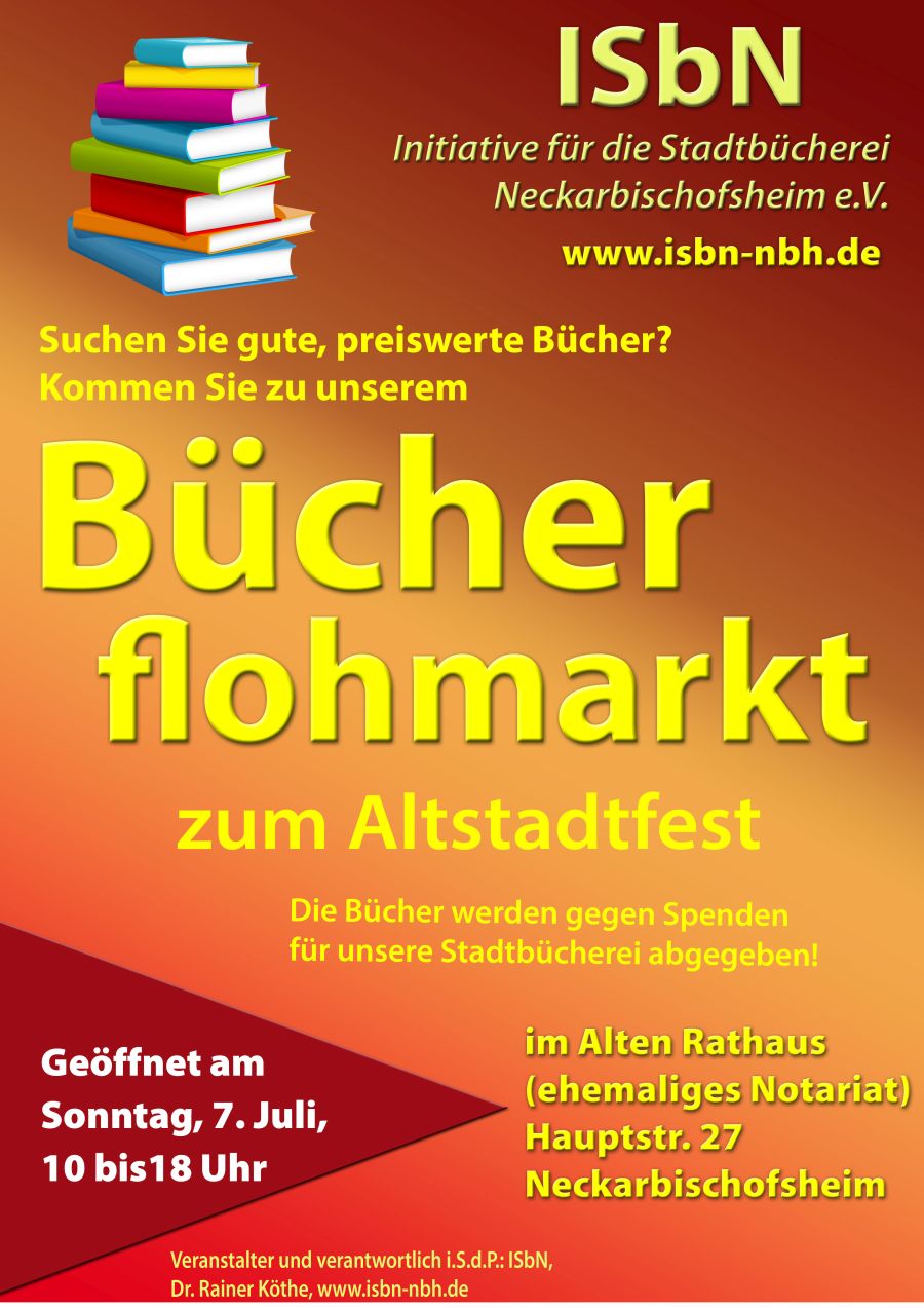 (zg) Am 6. und 7. Juli feiert Neckarbischofsheim sein Altstadtfest. Der Förderverein ISbN wird aus diesem Anlass wieder einen seiner beliebten Bücherflohmärkte veranstalten. Er findet statt am Sonntag, 7. Juli, von 10 bis 18 Uhr im Sitzungssaal des Alten Rathauses in Neckarbischofsheim. Interessierte haben die Auswahl unter mehr als 7000 Büchern, darunter Romane, Sachbücher aller Art sowie Kinder- und Jugendbücher.